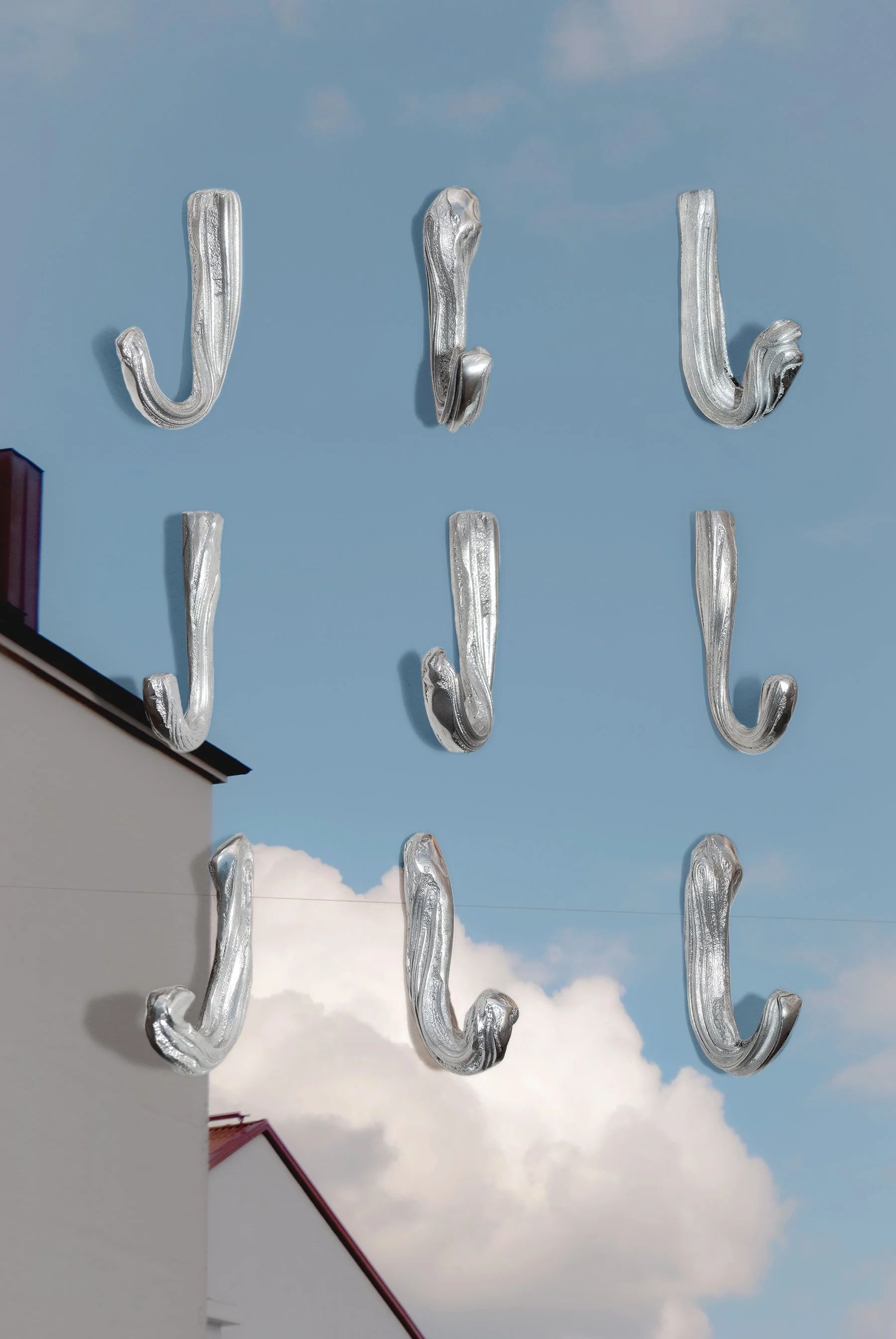 Hooks inspired by both toothpaste and taffy. An experimental process where polymer clay was softened and stretched, like in a candy factory. The clay originals were then sand-cast in aluminum, and cast in fiber reinforced Jesmonite using silicone molds.